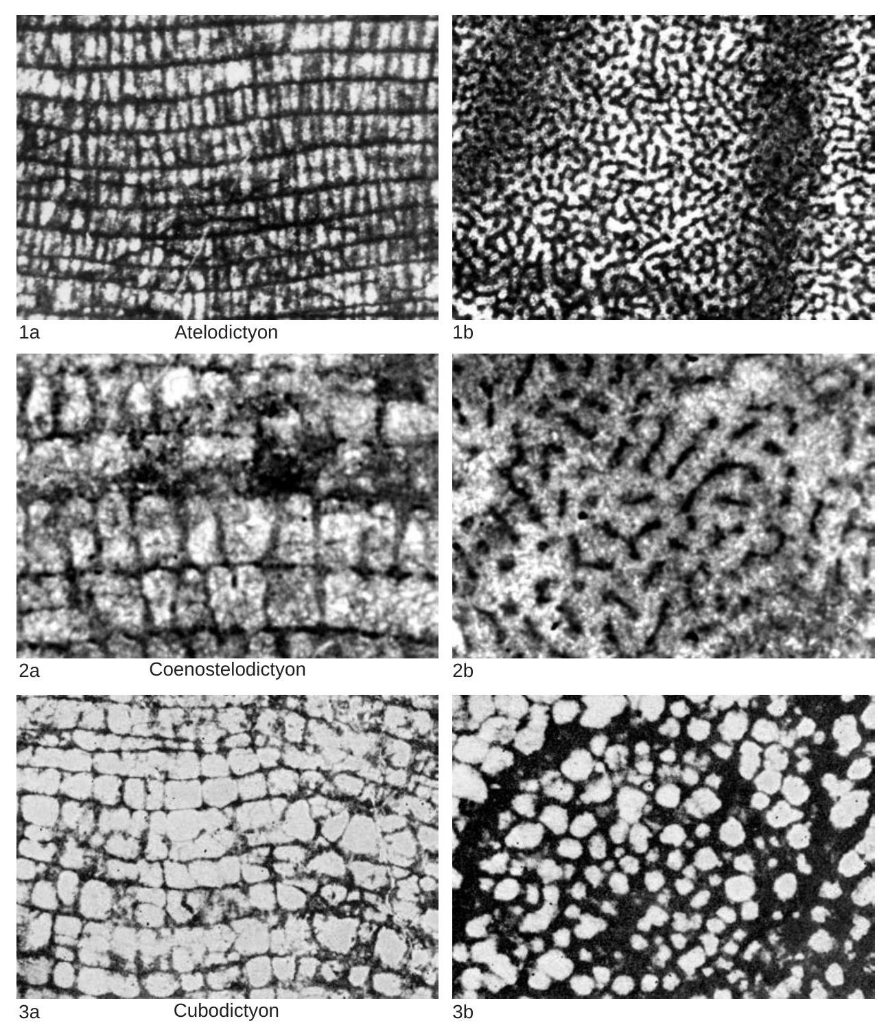 Growth form laminar or domical; laminae continuous, planar, thin; pillars bladelike, laterally joined in chains, short to superposed; galleries labyrinthine in tangential section, rectangular in longitudinal section; astrorhizae rare. [The original figures of Syringostroma verrucosum (Khalfina, 1961d, pl. D13,3a–b), designated as the type species of the genus Aculatostroma Khalfina, 1968b, clearly demonstrate that it has continuous laminae and so-called hexactinellid structure in the interlaminar space. Therefore, Aculatostroma is treated as a junior synonym of Atelodictyon.]