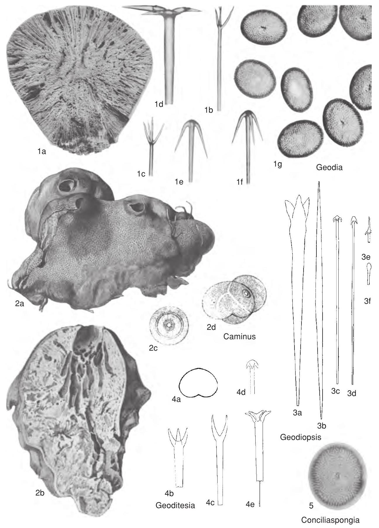 Globular to massive or lobate, inhalant chones as in Geodia, but exhalant water leaving through oscula of a few local, paragastral cavities, typical megascleres strongyles and orthotriaenes, but latter may be varied as dichotriaenes and strongyles may grade into oxea or amphitylote variants, no anatriaenes, accessory microscleres euasters and spheres or spheres only.