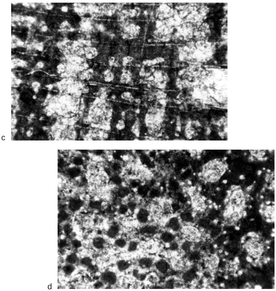 Fig. 443a-d. *T. warreni, holotype, ROM 12197, Presqu'ile Dolomite, Great Slave Lake, Canada, a, longitudinal section showing thin laminae and superposed pillars, X10, b, tangential section showing large circular pores through cut laminae, X10, c, longitudinal section showing compact vacuolate pillars and tripartite laminae, X30, d, tangential section showing vacuolate pillars, round in cross section, a lamina is cut obliquely on right side, X30 (Stearn, 2011b)